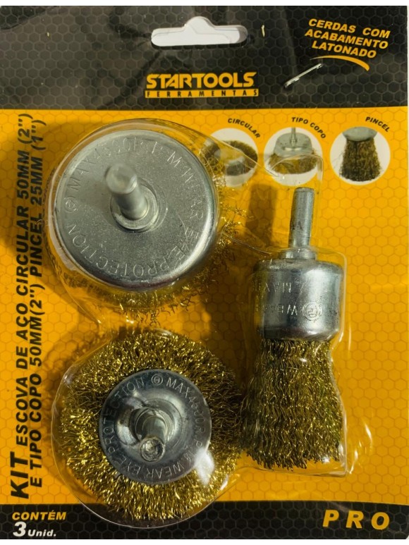 KIT ESCOVA DE ACO C/3PCS PINCEL 25MM, ESCOVA CIRCULAR 50MM E TIPO COPO 50MM UN.