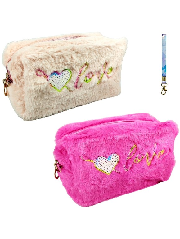 NECESSAIRE DE PELUCIA RETANGULAR LOVE C/ ALCA E ZIPER 19X11X7CM