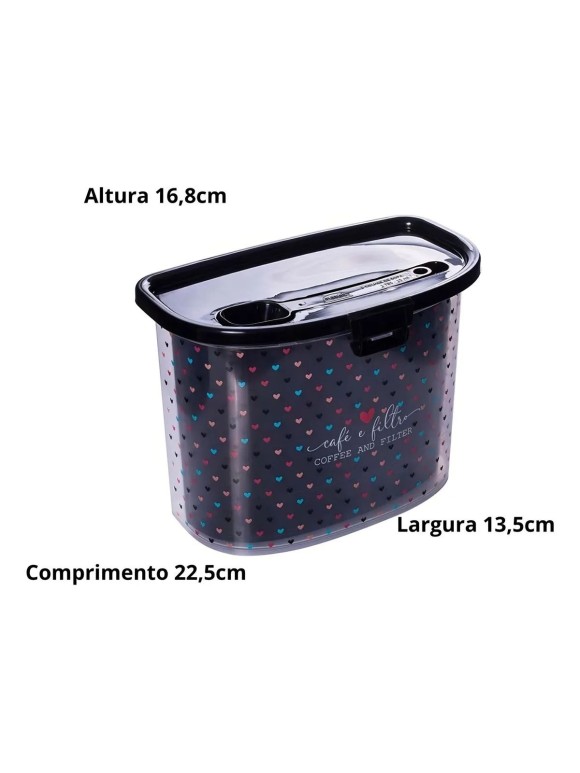 Formato: recipiente com tampa de encaixe e compartimentos internos — um para o café e outro para o filtro. A colher medidora se encaixa com praticidade na tampa, otimizando espaço