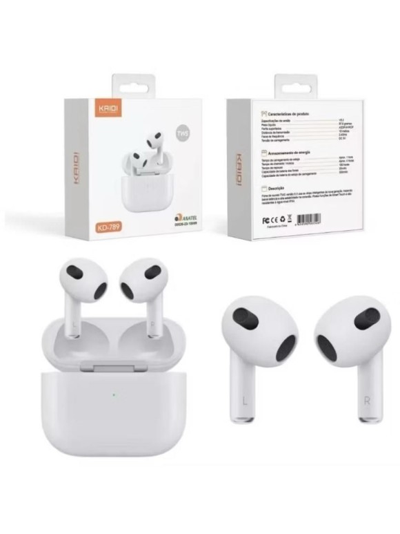 O Fone de Ouvido Sem Fio Kaidi TWS KD-789 oferece uma experiência de áudio superior com tecnologia Bluetooth 5.0 (ou 5.1 + EDR), som surround premium e autonomia de até 6 horas com os earphones e até 25 metros de alcance sem fio. Compactos e ergonômicos, são perfeitos para música, chamadas e uso diário com máxima liberdade, conforto e praticidade.