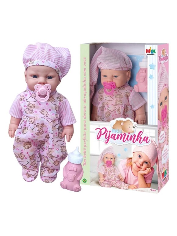 A Boneca Bebê Meu Pijaminha — Milk é um brinquedo encantador que reúne ternura, qualidade e segurança certificada, ideal para a brincadeira de faz-de-conta. Feita para proporcionar momentos de afeto e diversão, ela vem acompanhada de uma mamadeira e uma chupeta, fazendo companhia ideal para descansar e sonhar juntinho com as crianças.